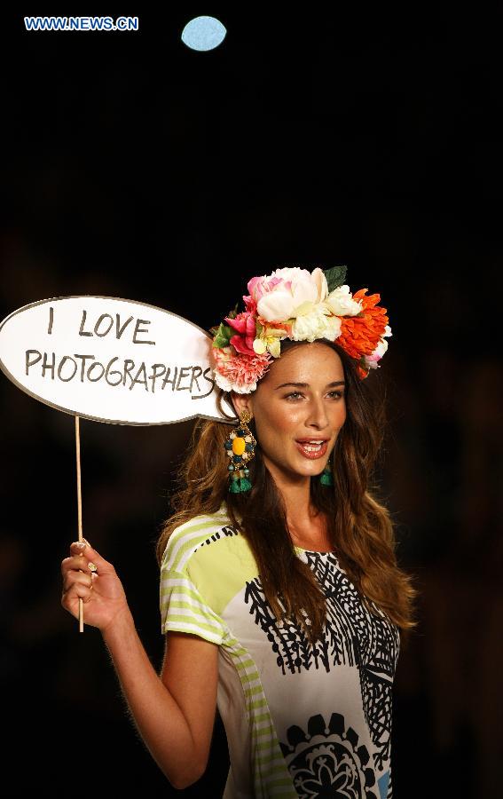 A model presents a creation from the Spring/Summer 2015 Desigual collection during the New York Fashion Week in New York, the United States, Sept. 4, 2014. (Xinhua/Wu Rong)