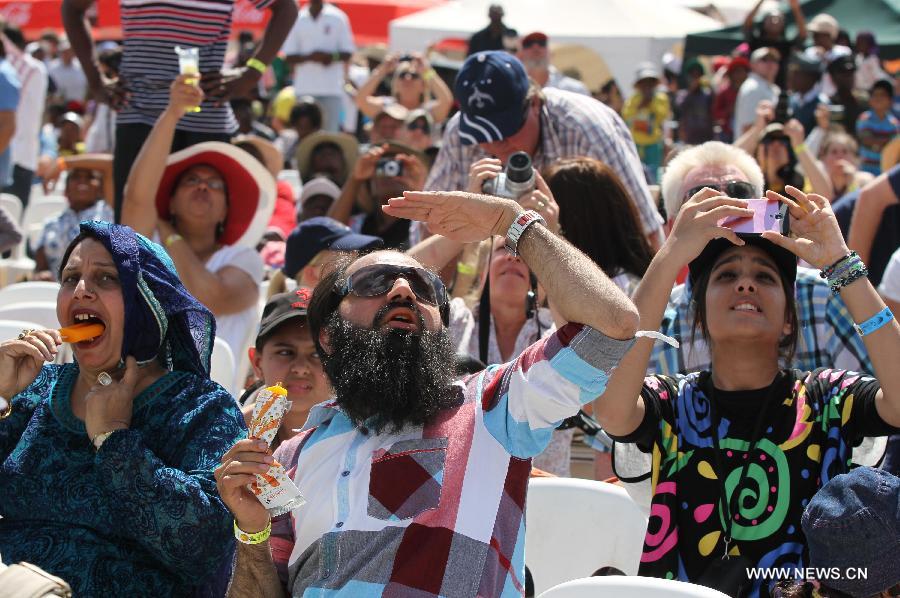 People watch pilots doing stunts during the Big African Show held at Prince Charles Airport on the outskirts of Harare, Zimbabwe, Sept. 7, 2014. Thousands of people paid to watch pilots from the Southern Africa display their skills using modern fighter jets and old war planes at the first large air show in the region since 1995. (Xinhua)