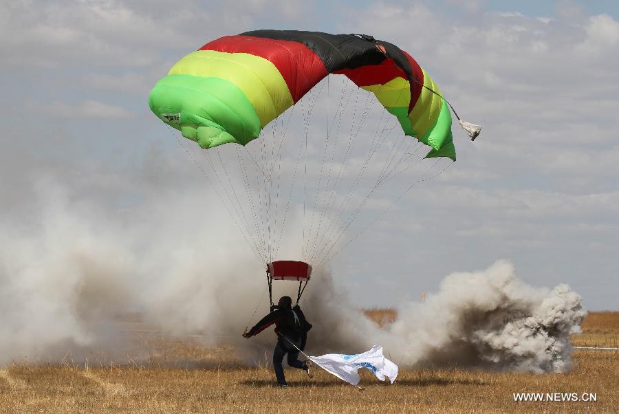 A parachuter lands during the Big African Show held at Prince Charles Airport on the outskirts of Harare, Zimbabwe, Sept. 7, 2014. Thousands of people paid to watch pilots from the Southern Africa display their skills using modern fighter jets and old war planes at the first large air show in the region since 1995. (Xinhua)