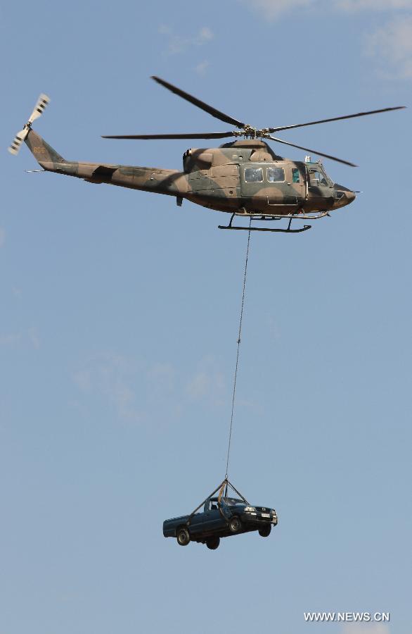 A military helicopter demonstrates lifting a car during the Big African Show held at Prince Charles Airport on the outskirts of Harare, Zimbabwe, Sept. 7, 2014. Thousands of people paid to watch pilots from the Southern Africa display their skills using modern fighter jets and old war planes at the first large air show in the region since 1995. (Xinhua)