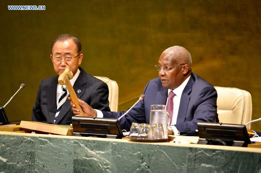 Sam Kahamba Kutesa (R), president of the 69th session of the UN General Assembly, strikes his gavel as he presides over the first plenary meeting of the session, at the UN headquarters in New York, on Sept. 16, 2014. The UN General Assembly started its 69th session at the UN Headquarters in New York on Tuesday. (Xinhua/Niu Xiaolei)