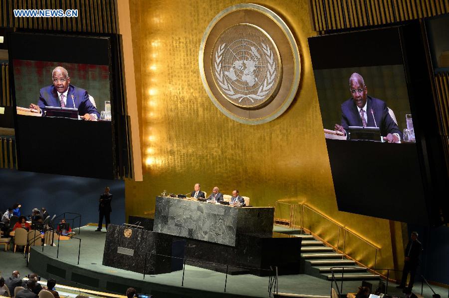 Sam Kahamba Kutesa (C), president of the 69th session of the UN General Assembly, presides over the first plenary meeting of the session, at the UN headquarters in New York, on Sept. 16, 2014. The UN General Assembly started its 69th session at the UN Headquarters in New York on Tuesday. (Xinhua/Niu Xiaolei)