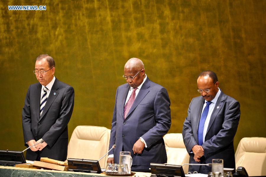 | Sam Kahamba Kutesa (R), president of the 69th session of the UN General Assembly, and UN Secretary-General Ban Ki-moon (L) observe a moment of meditation during the first plenary meeting of the session, at the UN headquarters in New York, on Sept. 16, 2014. The UN General Assembly started its 69th session at the UN Headquarters in New York on Tuesday. (Xinhua/Niu Xiaolei) |