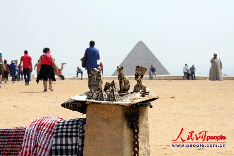 Souvenirs peddlers sell around pyramids. (People.cn/ Li Luying)