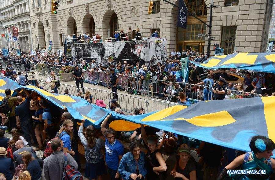 Protestors take part in the "flood Wall Street" demonstrations against climate change in New York, the United States, Spet. 22, 2014. (Xinhua/Yin Bogu)