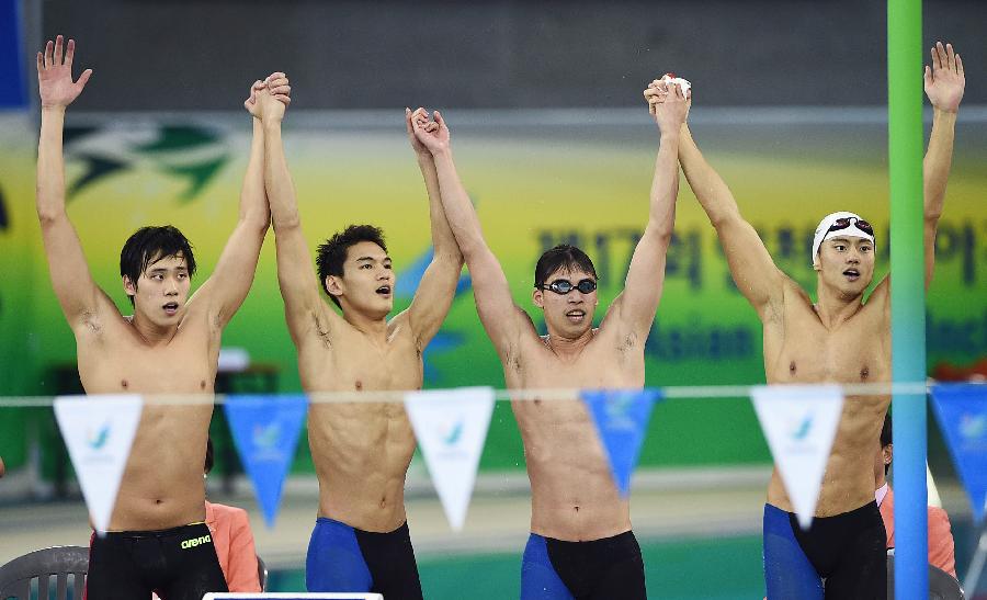 | Ning Zetao, Li Zhuhao ,Xu Jiayu and Li Xiang (R to L) of China greet audiences after the men's 4×100 medley relay final of swimming event at the 17th Asian Games in Incheon, South Korea, Sept. 26, 2014. China won the gold medal with 3 minutes and 31.37 seconds. (Xinhua/Wang Peng) |
