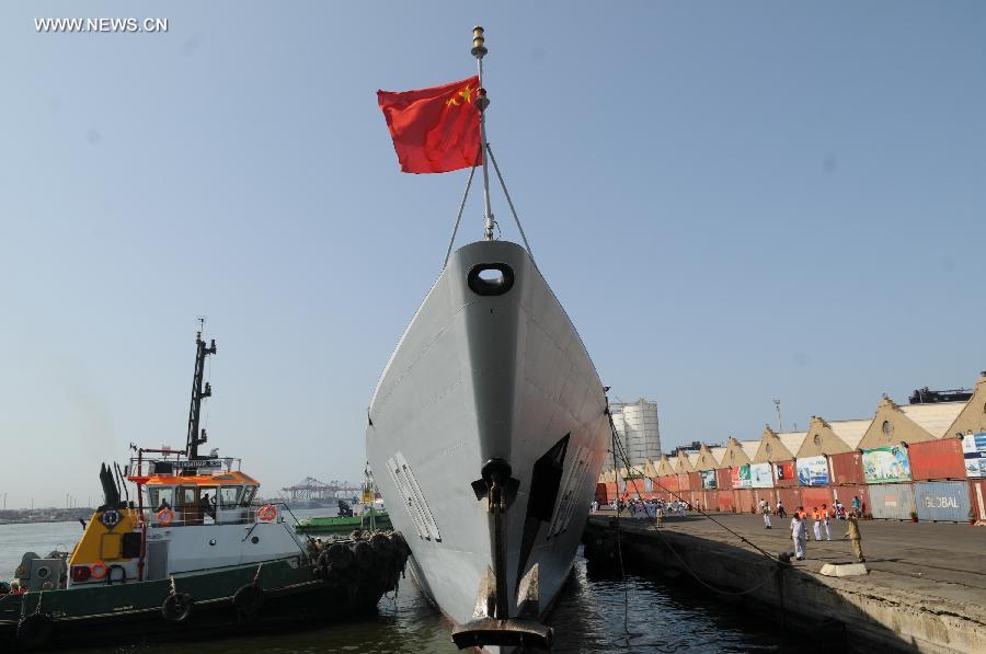 | Changchun destroyer of the 17th Chinese escort naval fleet arrives at Karachi port in southern Pakistani port city of Karachi on Sept. 27, 2014. The 17th Chinese escort naval fleet sent by the Chinese People's Liberation Army (PLA) Navy arrived in Karachi on Saturday for a five-day visit. (Xinhua/Ahmad Kamal) |