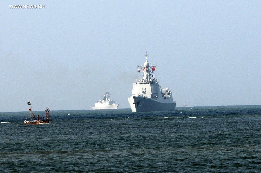 Changchun destroyer of the 17th Chinese escort naval fleet arrives at Karachi port in southern Pakistani port city of Karachi on Sept. 27, 2014. The 17th Chinese escort naval fleet sent by the Chinese People's Liberation Army (PLA) Navy arrived in Karachi on Saturday for a five-day visit. (Xinhua/Ahmad Kamal)