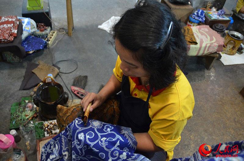 A female artisan waxes the cloth carefully. (People's Daily Online/Yang Mu)