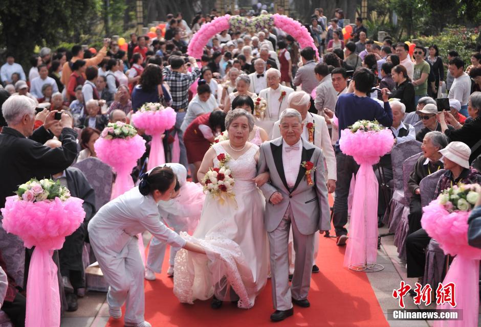| A Golden wedding ceremony is held in Chongqing on May 11, 2014. 19 old couples carrying roses and wearing wedding dresses attended the ceremony. The oldest of them was 94 years old and the youngest 70 years old. (Chinanews.com/Chen Chao) |