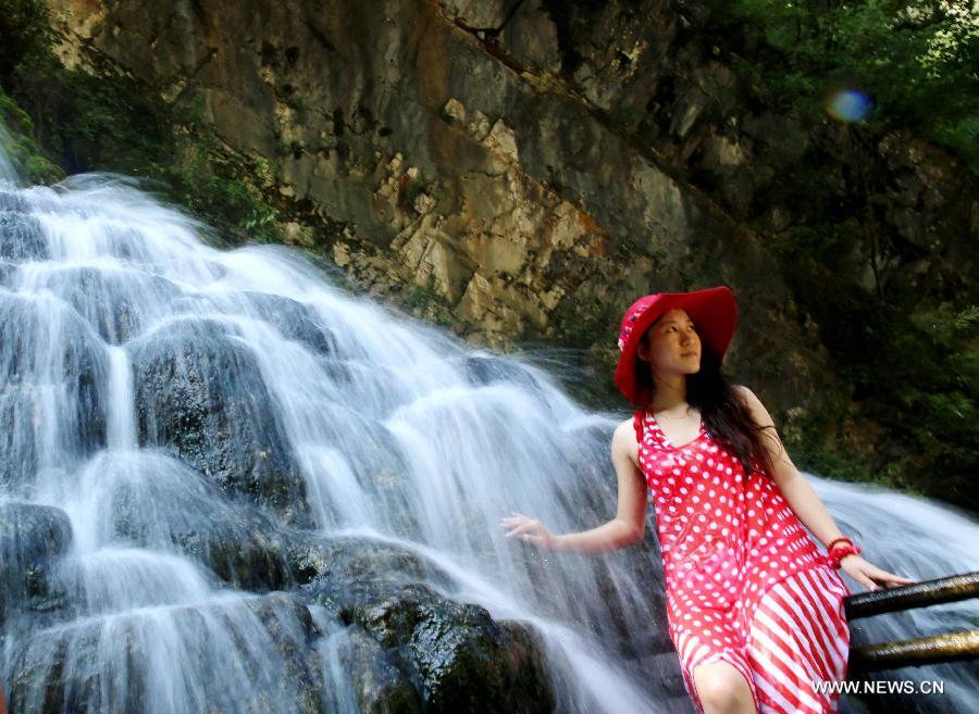 A tourist poses for photo in front of the Luobi hot spring waterfall in Qiaowo Township of Puge County in Liangshan Yi Autonomous Prefecture, southwest China's Sichuan Province, Oct. 1, 2014. The temperature of the hot spring waterfall here maintains at 40 degrees Celsius all the year round. (Xinhua/Cheng Xueli)