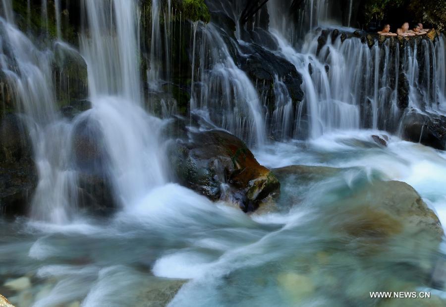 Tourists have a bath in the Luobi hot spring waterfall in Qiaowo Township of Puge County in Liangshan Yi Autonomous Prefecture, southwest China's Sichuan Province, Oct. 1, 2014. The temperature of the hot spring waterfall here maintains at 40 degrees Celsius all the year round. (Xinhua/Cheng Xueli)