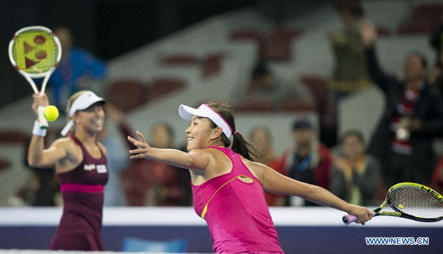 Andrea Hlavackova of Czech Republic and Peng Shuai (R) of China celebrate for victory after their women's doubles final match against Cara Black of Zimbabwe and Sania Mirza of India at the China Open tennis tournament in Beijing, China, Oct. 4, 2014. Andrea Hlavackova and Peng Shuai won 2-0 to claim the champion. (Xinhua/Zhang Yu)