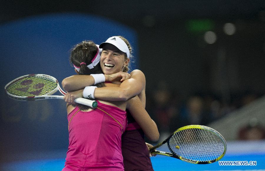 Andrea Hlavackova (R) of Czech Republic hugs with Peng Shuai of China after winning their women's doubles final match against Cara Black of Zimbabwe and Sania Mirza of India at the China Open tennis tournament in Beijing, China, Oct. 4, 2014. Andrea Hlavackova and Peng Shuai won 2-0 to claim the champion. (Xinhua/Zhang Yu)