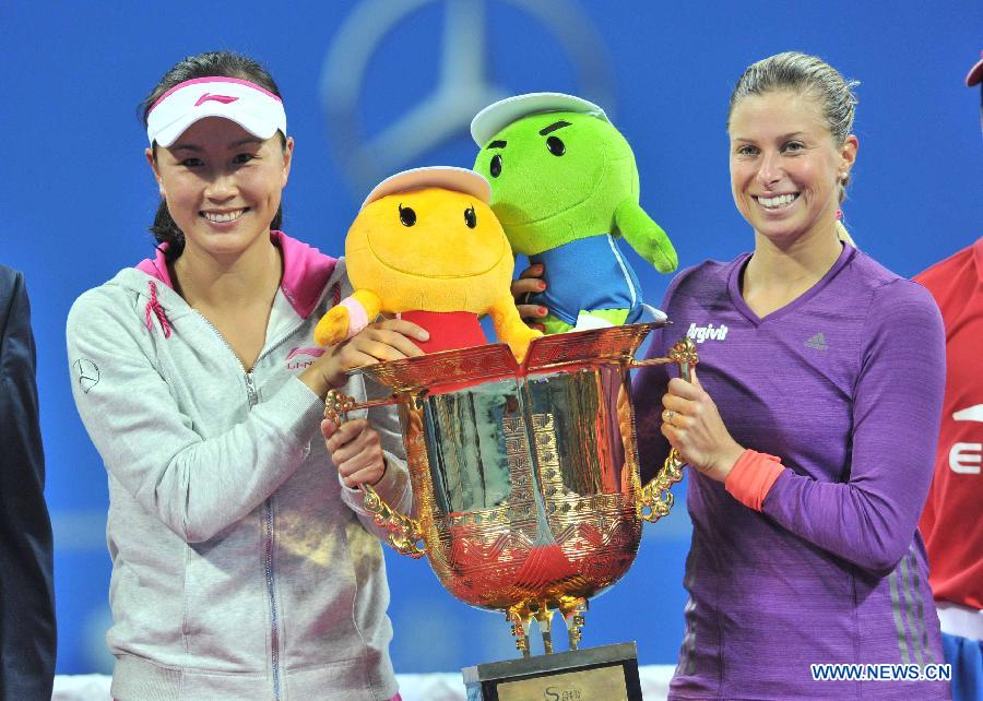 Andrea Hlavackova (R) of Czech Republic and Peng Shuai of China pose with the trophy during the awarding ceremony of the women's doubles final match against Cara Black of Zimbabwe and Sania Mirza of India at the China Open tennis tournament in Beijing, China, Oct. 4, 2014. Andrea Hlavackova and Peng Shuai won 2-0 to claim the champion. (Xinhua/Li Wen)