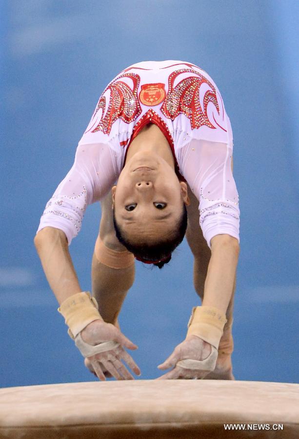 Chinese gymnast Yao Jinnan performs on the vault during the women's qualifying round of the 45th Gymnastics World Championships in Nanning, capital of south China's Guangxi Zhuang Autonomous Region, Oct. 6, 2014. The 45th FIG Artistic Gymnastics World Championships lasts from Oct. 3 to 12 in Nanning. (Xinhua/Chen Zixia)