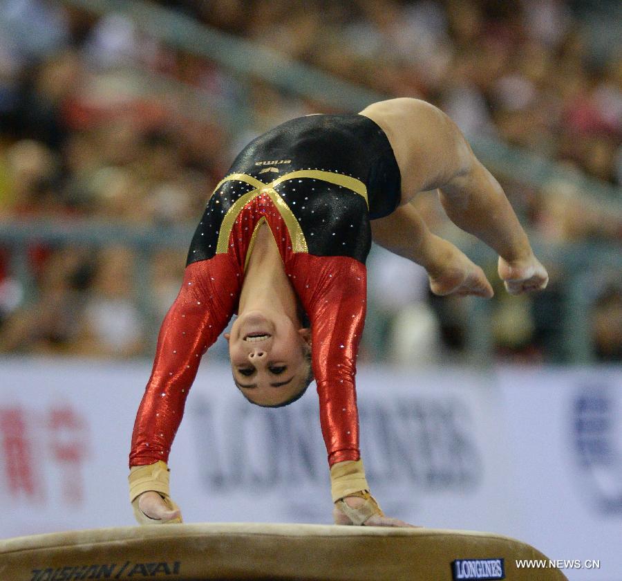 German gymnast Cagla Akyol performs on the vault during the women's qualifying round of the 45th Gymnastics World Championships in Nanning, capital of south China's Guangxi Zhuang Autonomous Region, Oct. 6, 2014. The 45th FIG Artistic Gymnastics World Championships lasts from Oct. 3 to 12 in Nanning. (Xinhua/Li Qiaoqiao)