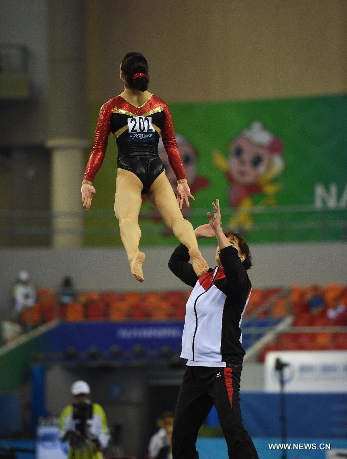 German gymnast Kim Bui warms up during the women's qualifying round of the 45th Gymnastics World Championships in Nanning, capital of south China's Guangxi Zhuang Autonomous Region, Oct. 6, 2014. The 45th FIG Artistic Gymnastics World Championships lasts from Oct. 3 to 12 in Nanning. (Xinhua/Li Qiaoqiao)