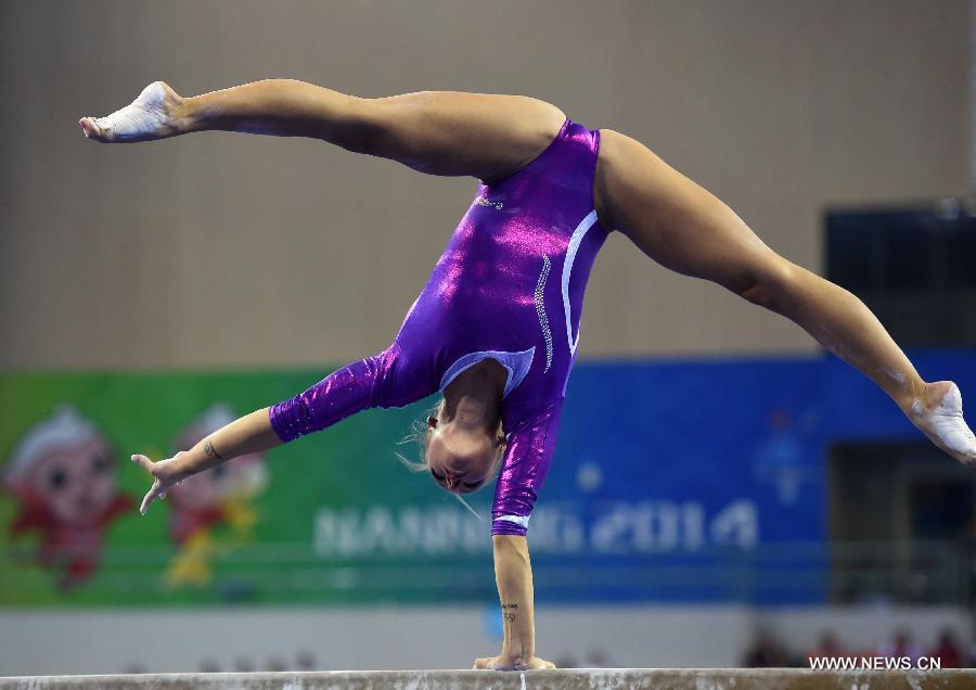 Boczogo Dorina of Hungary performs on the balance beam during the women's qualifying round of the 45th Gymnastics World Championships in Nanning, capital of south China's Guangxi Zhuang Autonomous Region, Oct. 5, 2014. The 45th FIG Artistic Gymnastics World Championships lasts from Oct. 3 to 12 in Nanning. (Xinhua/Zhou Hua)