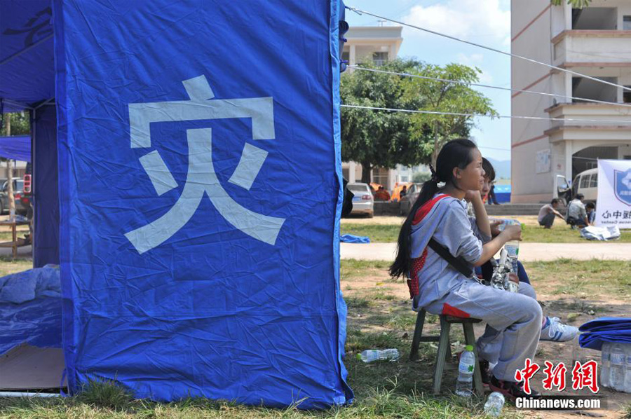 | Students sit beside tents put up on the playground of the central primary school of Yongping, Jinggu. the tents, on Oct. 8. As aftershocks continued, local schools have been closed. (China News Agency/Ren Dong) |