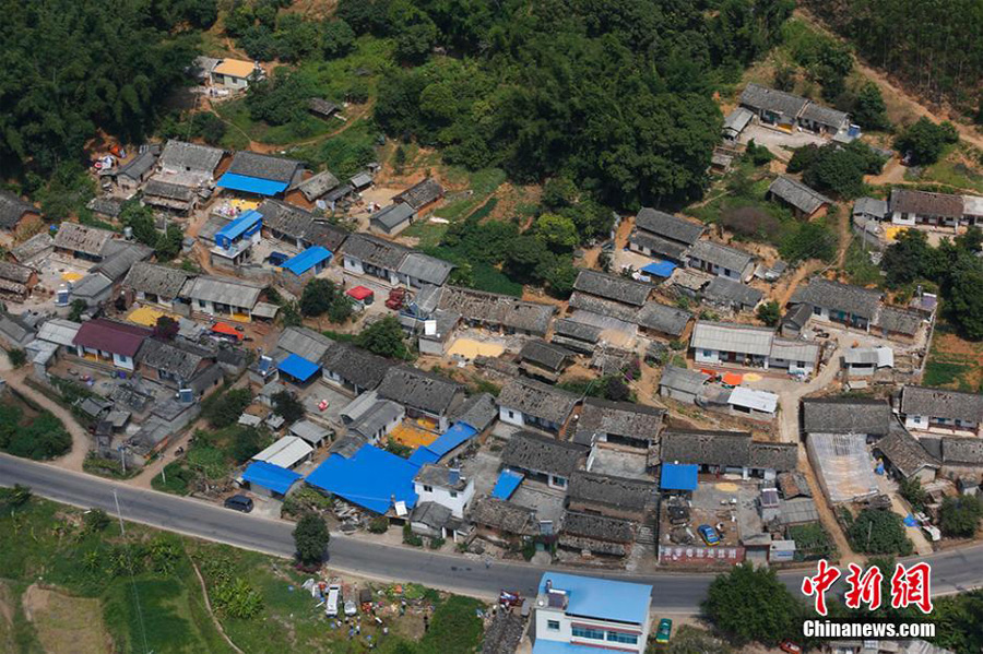An Aerial photo of the quake-hit area, Jinggu. (China News Agency/Min Zhong) After the severe earthquake jolted Jinggu, Yunnan, the air force from the Chengdu Military Command started contingency plans immediately and dispatched troops to the disaster area. Helicopters took aerial photos of the earthquake-hit area.
