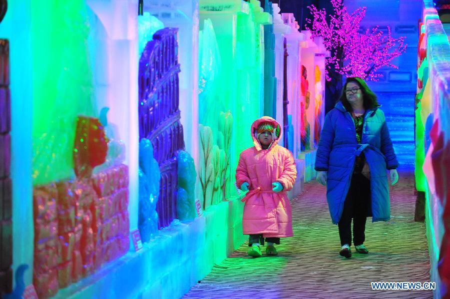 Thai people walk in the newly opened Harbin Ice Wonderland in Bangkok, Thailand, Oct 10, 2014. The leisure park is kept at a temperature of minus 15 degrees Celsius and features ice sculptures created by artists from Harbin City of northeast China's Heilongjiang province. (Xinhua/Rachen Sageamsak)