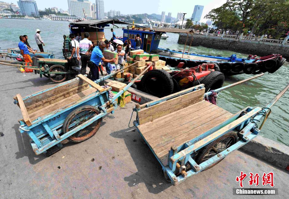 Handcart workers experience low season and peak season on the island. They are extremely busy during peak seasons and National Day. (CNS/Zhang Bin)
