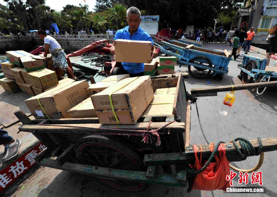 More than 80,000 tourists visited Gulangyu during National Day, providing more opportunities for handcart workers to earn money. (CNS/Zhang Bin)