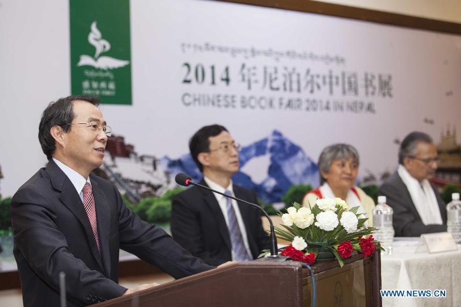 Head of the Book Fair delegation Dong Yunhu (1st L) delivers a speech during the opening ceremony of the Chinese Book Fair in Kathmandu, capital of Nepal, on Oct. 11, 2014. The book fair will run till Oct. 16, 2014. (Xinhua/Pratap Thapa)