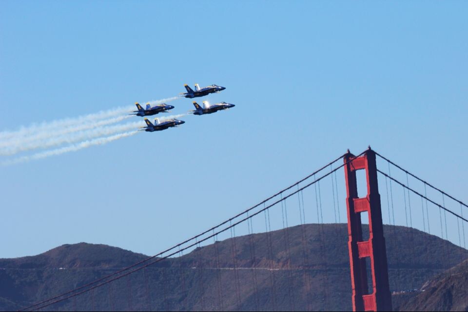 The U.S. Navy Blue Angels fly during the Fleet Week Air Show in San Francisco on October 12, 2014. (People's Daily Onine/Wang Jun)