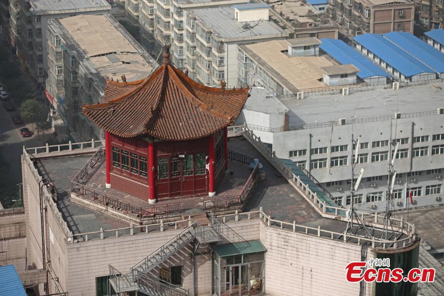 An old-style Chinese pavilion with golden roof and red wall is seen built on roof of a high-rise modern architecture in Taiyuan, North China’s Shanxi province on October 15, 2014. [Photo: China News Service/ Wu Junjie]