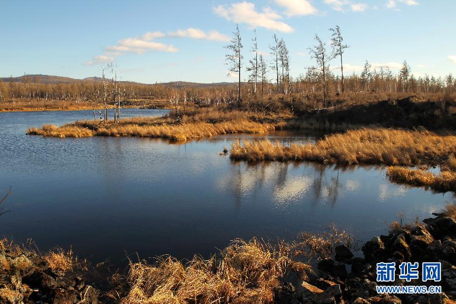 | Photo taken on Oct 12, 2014 shows the autumn scenery of the Dujuan Lake in Arxan forests in Dahinggan Mountains, north China's Inner Mongolia Autonomous Region. (Photo/Xinhua News Agency) |