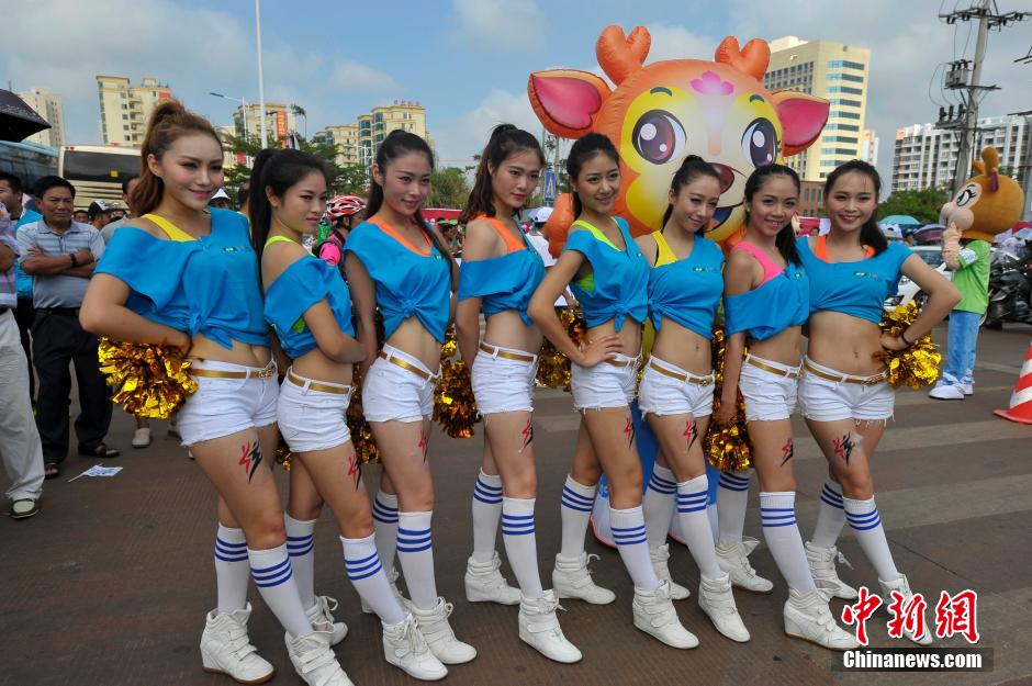 The first stage of 2014 Tour of Hainan kicks off in Chengmai, south China's Hainan province on Oct.20, 2014. Cheerleaders in bright-color clothes dancing to music were quite attractive before the match. (CNS/Luo Yunfei)