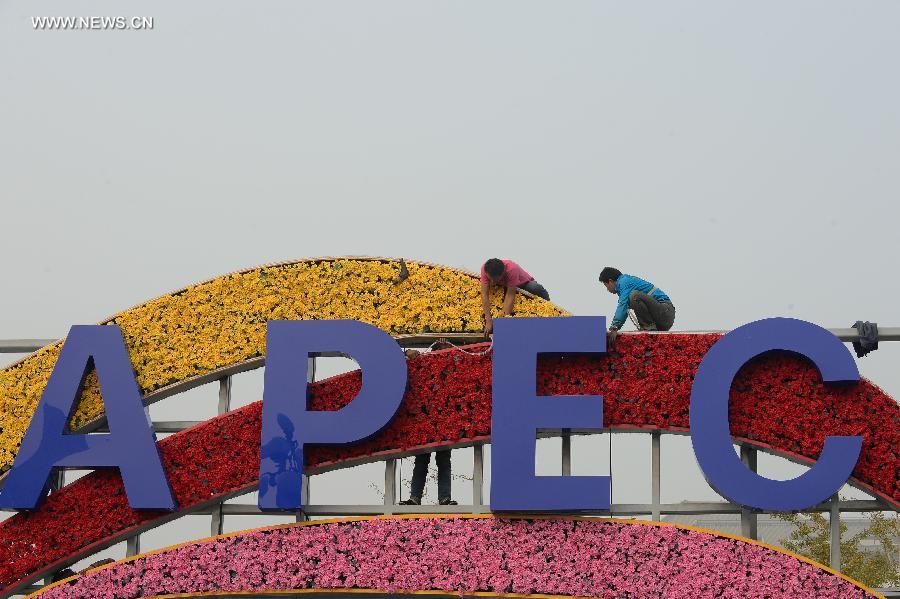 | Workers set up a flower decoration for the upcoming APEC meeting in Xidan of Beijing, China, Oct. 25, 2014. The APEC Economic Leaders' Meeting will be held in Beijing from Nov. 10 to 11. The APEC leaders' week also includes the final senior officials' meeting from Nov. 5 to 6 and the 26th ministerial meeting from Nov. 7 to 8. (Xinhua/Yin Dongxun) |