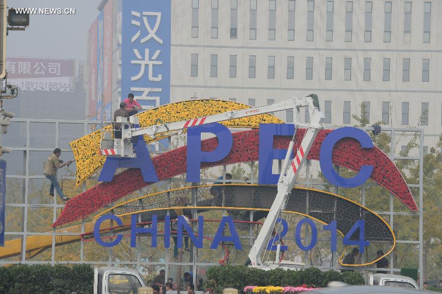Workers set up a flower decoration for the upcoming APEC meeting in Xidan of Beijing, China, Oct. 25, 2014. The APEC Economic Leaders' Meeting will be held in Beijing from Nov. 10 to 11. The APEC leaders' week also includes the final senior officials' meeting from Nov. 5 to 6 and the 26th ministerial meeting from Nov. 7 to 8. (Xinhua/Yin Dongxun)