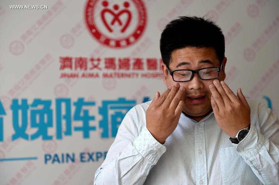 A man tears after experiencing the pain of childbirth at a pain experience camp in Ji'nan, capital of east China's Shandong Province, Nov. 3, 2014. Volunteers attended the activity here on Monday to understand the hardness of childbirth. (Xinhua/Guo Xulei)