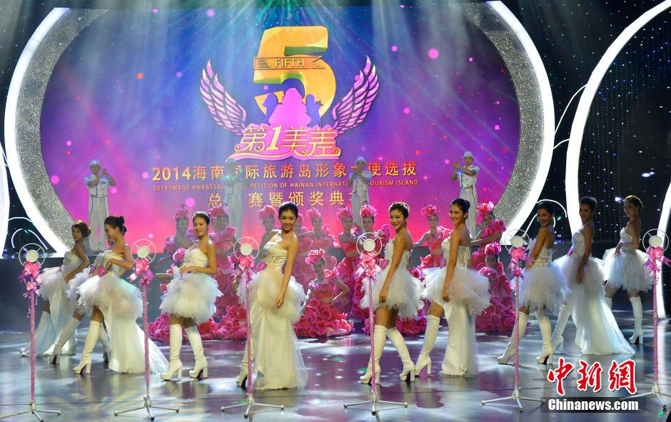 Zhao Yujia (Middle) from northern China's Shanxi Province wins the final round of the tourism ambassador competition, followed by Zhang Xinyu (R) and Pei You, in south China's Hainan Province on Nov. 9, 2014. The win made her the tourism ambassador of the province.