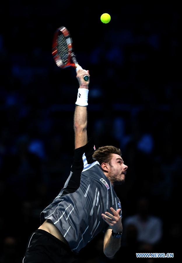 Stan Wawrinka of Switzerland serves during the ATP World Tour Finals Group A match against Tomas Berdych of Czech Republic in London, Britain on November 10, 2014. Wawrinka defeated Berdych 2-0. (Xinhua/Han Yan)