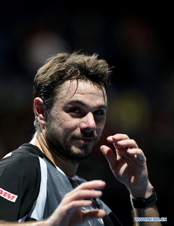 Stan Wawrinka of Switzerland gestures as he answers questions after the ATP World Tour Finals Group A match against Tomas Berdych of Czech Republic in London, Britain on November 10, 2014. Wawrinka defeated Berdych 2-0. (Xinhua/Han Yan)