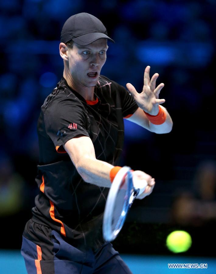 | Tomas Berdych of Czech Republic returns the ball during the ATP World Tour Finals Group A match against Stan Wawrinka of Switzerland in London, Britain on November 10, 2014. Tomas Berdych lost 0-2. (Xinhua/Han Yan) |