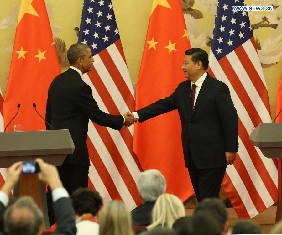 | Chinese President Xi Jinping (R) shakes hands with U.S. President Barack Obama at a press conference following their talks at the Great Hall of the People in Beijing, capital of China, Nov. 12, 2014. (Xinhua/Liu Weibing) |