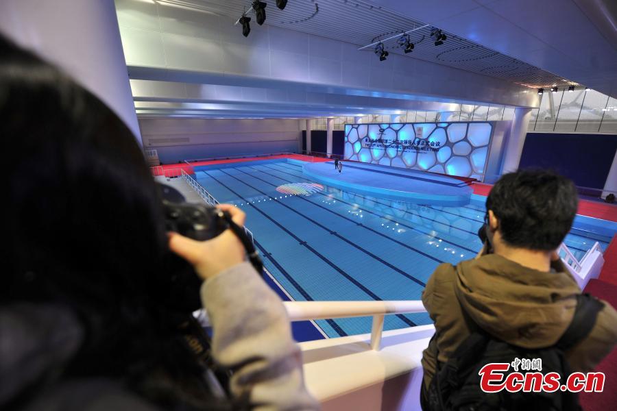 Journalists take photos in the Water Cube in Beijing on November 15, 2014. The Water Cube, also known as the National Aquatics Center will reopen to the public on November 22 after the APEC meeting. APEC leaders gathered at the Water Cube on November 10, where they took a group photo wearing traditional Chinese outfits and later attended a banquet with local delicacies from across China. The new decorations done for APEC will be preserved after it's reopened to the public. Visitors can take photos at the same place where the APEC leaders had their photo taken and have a close look at the welcome banquet and even enjoy the delicious banquet dishes. [Photo: Chinanews.com/ Jin Shuo]