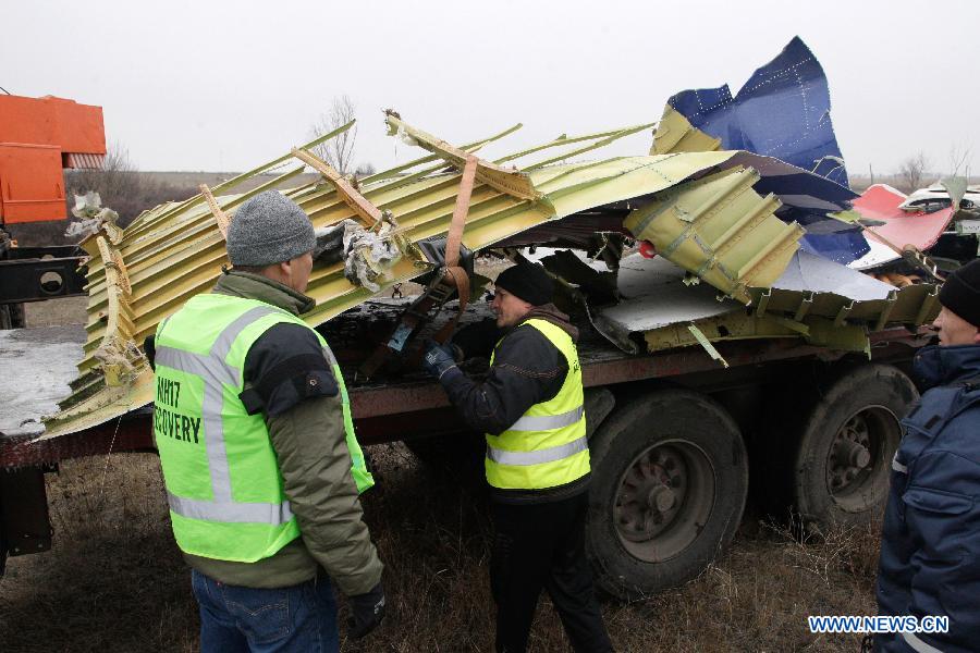 Workers work on the site where the MH17 plane of Malaysia Airlines crashed, on the outskirts of Donetsk, eastern Ukraine, on Nov. 18, 2014. The recovery of the wreckage of flight MH17 will be completed in around five days, the Dutch Safety Board, leading the investigation into the crash in eastern Ukraine, announced on Monday. (Xinhua/Alexander Ermochenko)
