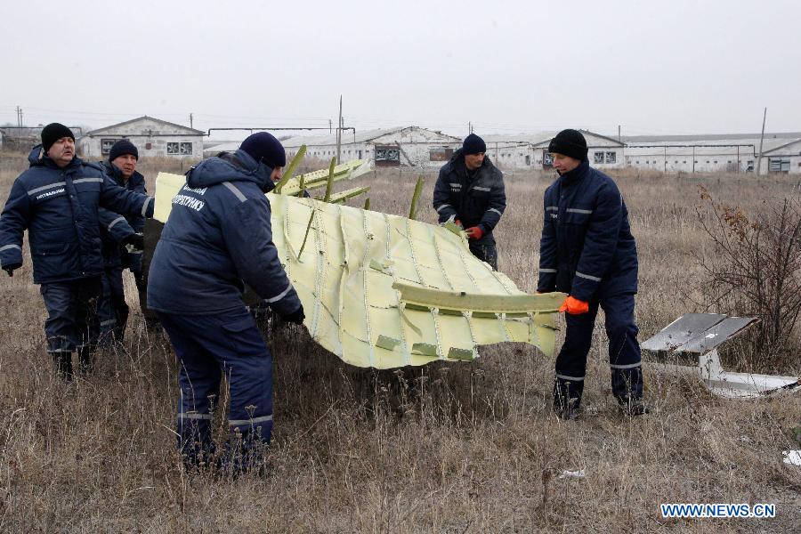 Workers work on the site where the MH17 plane of Malaysia Airlines crashed, on the outskirts of Donetsk, eastern Ukraine, on Nov. 18, 2014. The recovery of the wreckage of flight MH17 will be completed in around five days, the Dutch Safety Board, leading the investigation into the crash in eastern Ukraine, announced on Monday. (Xinhua/Alexander Ermochenko)