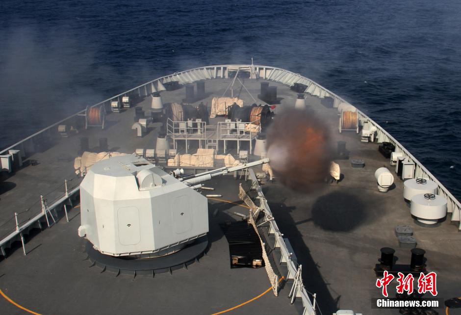 Dock landing ship “Changbaishan” of the 18th escort taskforce of the Chinese Navy successfully conduct an open sea attack and defense drill in the Gulf of Aden on Nov. 17, 2014. (Chinanews/Yan Bin)
