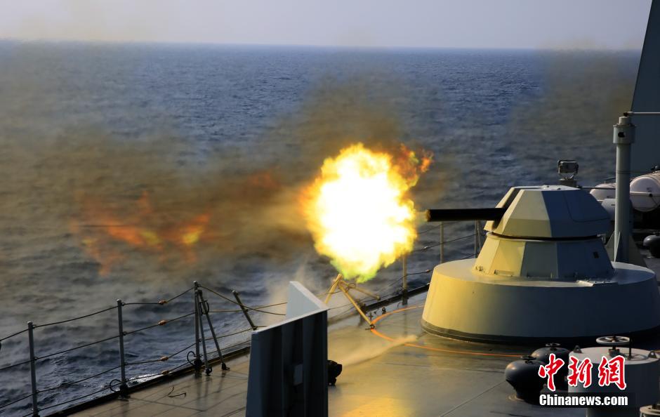 Dock landing ship “Changbaishan” of the 18th escort taskforce of the Chinese Navy successfully conduct an open sea attack and defense drill in the Gulf of Aden on Nov. 17, 2014. (Chinanews/Yan Bin)