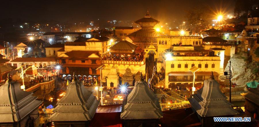 Hindu devotees gather to perform religious rituals during Bala Chaturdashi Festival at the Pashupatinath temple in Kathmandu, Nepal, Nov. 20, 2014. The festival is celebrated annually by staying whole night with lighting oil lamps and perfoming rituals during which people offer various seeds to pay homage to their deceased parents. (Xinhua/Sunil Sharma)