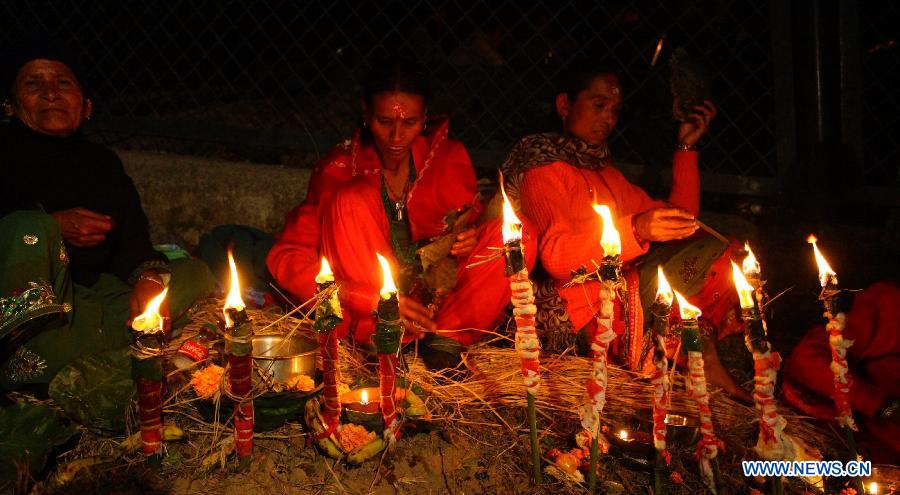 Hindu devotees light oil lamps to perform religious rituals during Bala Chaturdashi Festival at the Pashupatinath temple in Kathmandu, Nepal, Nov. 20, 2014. The festival is celebrated annually by staying whole night with lighting oil lamps and perfoming rituals during which people offer various seeds to pay homage to their deceased parents. (Xinhua/Sunil Sharma)
