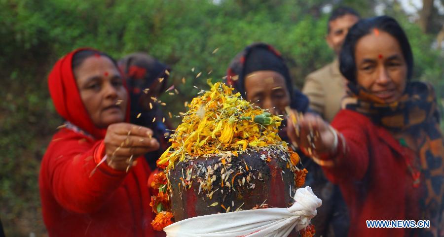 Hindu devotees offer grains to Lord Shiva at Pashupatinath Temple during Bala Chaturdashi festival in Kathmandu, Nepal, Nov. 21, 2014. The festival is celebrated annually by staying whole night with lighting oil lamps and perfoming rituals during which people offer various seeds to pay homage to their deceased parents. (Xinhua/Sunil Sharma)