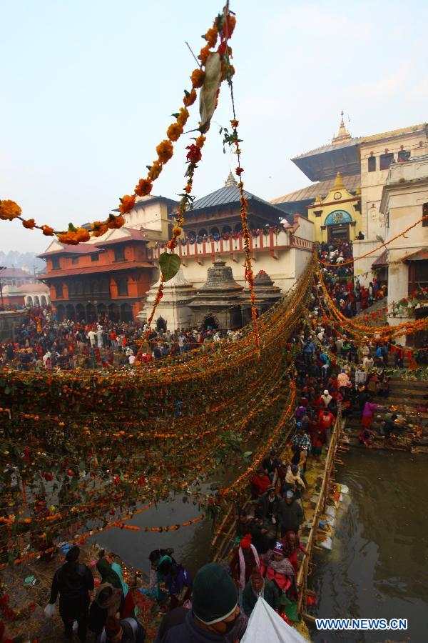 | Hindu Pilgrims walk along premises around the Pashupatinath Temple scattering grains during Bala Chaturdashi Festival in Kathmandu, Nepal, Nov. 21, 2014. The festival is celebrated annually by staying whole night with lighting oil lamps and perfoming rituals during which people offer various seeds to pay homage to their deceased parents. (Xinhua/Sunil Sharma) |